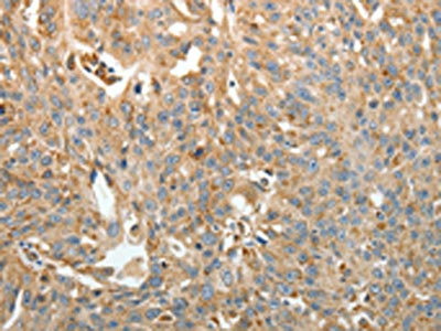 The image on the left is immunohistochemistry of paraffin-embedded Human liver cancer tissue using CSB-PA093393(RETNLB Antibody) at dilution 1/20, on the right is treated with fusion protein. (Original magnification: ×200)
