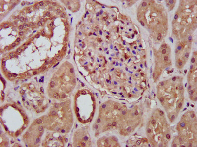 IHC image of CSB-PA019617LA01HU diluted at 1:400 and staining in paraffin-embedded human kidney tissue performed on a Leica BondTM system. After dewaxing and hydration, antigen retrieval was mediated by high pressure in a citrate buffer (pH 6.0). Section was blocked with 10% normal goat serum 30min at RT. Then primary antibody (1% BSA) was incubated at 4°C overnight. The primary is detected by a biotinylated secondary antibody and visualized using an HRP conjugated SP system.