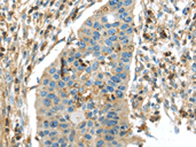 The image on the left is immunohistochemistry of paraffin-embedded Human esophagus cancer tissue using CSB-PA087089(RIPK4 Antibody) at dilution 1/40, on the right is treated with synthetic peptide. (Original magnification: ×200)