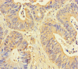 Immunohistochemistry of paraffin-embedded human colon cancer using CSB-PA05124A0Rb at dilution of 1:100