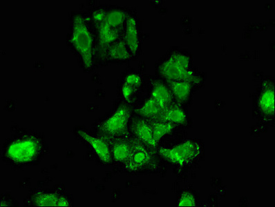 • Immunofluorescent analysis of HepG2 cells using CSB-PA618984LA01HU at dilution of 1:100 and Alexa Fluor 488-congugated AffiniPure Goat Anti-Rabbit IgG(H+L)