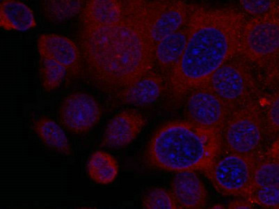 Immunofluorescence staining of methanol-fixed MCF7 cells using p70 S6 Kinase(Ab-411) Antibody.