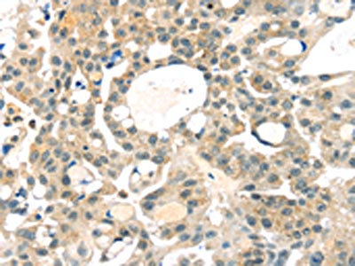 • The image on the left is immunohistochemistry of paraffin-embedded Human breast cancer tissue using CSB-PA071515(RRAGA Antibody) at dilution 1/25, on the right is treated with fusion protein. (Original magnification: ×200)