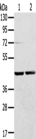 • Gel: 8%SDS-PAGE, Lysate: 40 μg, Lane 1-2: Hepg2 cells, hela cells, Primary antibody: CSB-PA071515(RRAGA Antibody) at dilution 1/400, Secondary antibody: Goat anti rabbit IgG at 1/8000 dilution, Exposure time: 3 seconds