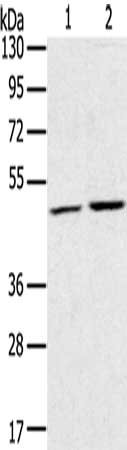 • Gel: 8%SDS-PAGE, Lysate: 40 μg, Lane 1-2: K562 cells, NIH/3T3 cells, Primary antibody: CSB-PA038367(RRAGC Antibody) at dilution 1/400, Secondary antibody: Goat anti rabbit IgG at 1/8000 dilution, Exposure time: 5 seconds