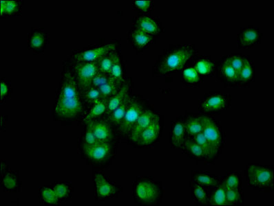 Immunofluorescence staining of HepG2 cells with CSB-PA020622HA01HU at 1:133, counter-stained with DAPI. The cells were fixed in 4% formaldehyde, permeabilized using 0.2% Triton X-100 and blocked in 10% normal Goat Serum. The cells were then incubated with the antibody overnight at 4°C. The secondary antibody was Alexa Fluor 488-congugated AffiniPure Goat Anti-Rabbit IgG(H+L).
