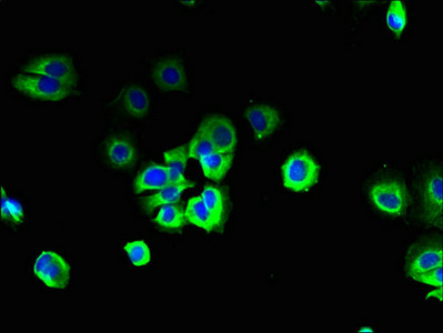 • Immunofluorescent analysis of MCF-7 cells using CSB-PA859932LA01HU at dilution of 1:100 and Alexa Fluor 488-congugated AffiniPure Goat Anti-Rabbit IgG(H+L)