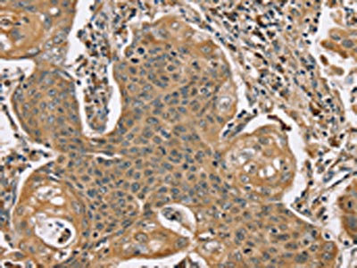 The image on the left is immunohistochemistry of paraffin-embedded Human cervical cancer tissue using CSB-PA993283(SCGB2A1 Antibody) at dilution 1/20, on the right is treated with fusion protein. (Original magnification: ×200)
