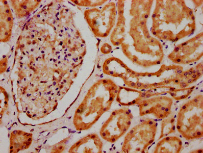 IHC image of CSB-PA020827LA01HU diluted at 1:700 and staining in paraffin-embedded human kidney tissue performed on a Leica BondTM system. After dewaxing and hydration, antigen retrieval was mediated by high pressure in a citrate buffer (pH 6.0). Section was blocked with 10% normal goat serum 30min at RT. Then primary antibody (1% BSA) was incubated at 4°C overnight. The primary is detected by a biotinylated secondary antibody and visualized using an HRP conjugated SP system.