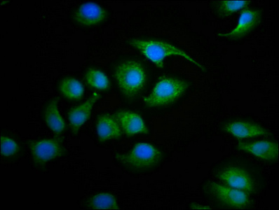 Immunofluorescence staining of A549 cells with CSB-PA885749LA01HU at 1:100, counter-stained with DAPI. The cells were fixed in 4% formaldehyde, permeabilized using 0.2% Triton X-100 and blocked in 10% normal Goat Serum. The cells were then incubated with the antibody overnight at 4°C. The secondary antibody was Alexa Fluor 488-congugated AffiniPure Goat Anti-Rabbit IgG(H+L).