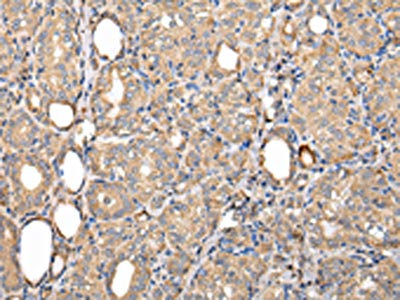 • The image on the left is immunohistochemistry of paraffin-embedded Human thyroid cancer tissue using CSB-PA783838(SERPINA7 Antibody) at dilution 1/25, on the right is treated with fusion protein. (Original magnification: ×200)