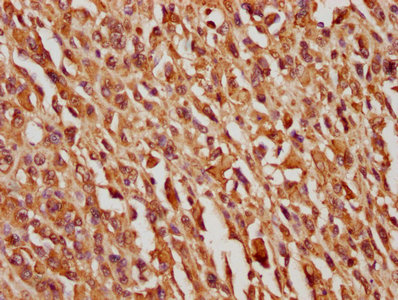 IHC image of CSB-PA021084LA01HU diluted at 1:100 and staining in paraffin-embedded human melanoma cancer performed on a Leica BondTM system. After dewaxing and hydration, antigen retrieval was mediated by high pressure in a citrate buffer (pH 6.0). Section was blocked with 10% normal goat serum 30min at RT. Then primary antibody (1% BSA) was incubated at 4°C overnight. The primary is detected by a biotinylated secondary antibody and visualized using an HRP conjugated SP system.