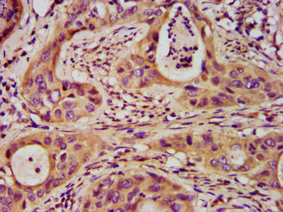 IHC image of CSB-PA021141LA01HU diluted at 1:200 and staining in paraffin-embedded human cervical cancer performed on a Leica BondTM system. After dewaxing and hydration, antigen retrieval was mediated by high pressure in a citrate buffer (pH 6.0). Section was blocked with 10% normal goat serum 30min at RT. Then primary antibody (1% BSA) was incubated at 4°C overnight. The primary is detected by a biotinylated secondary antibody and visualized using an HRP conjugated SP system.