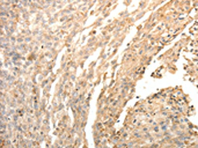 The image on the left is immunohistochemistry of paraffin-embedded Human ovarian cancer tissue using CSB-PA820032(SFTPD Antibody) at dilution 1/30, on the right is treated with fusion protein. (Original magnification: ×200)