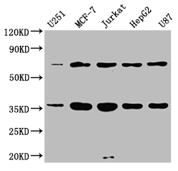 Positive WB detected in: U251 whole cell lysate, MCF-7 whole cell lysate, Jurkat whole cell lysate, HepG2 whole cell lysate, U87 whole cell lysate