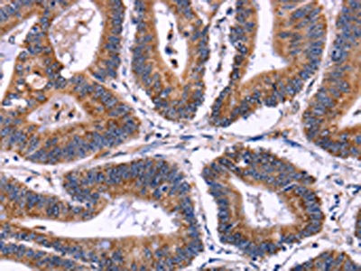 The image on the left is immunohistochemistry of paraffin-embedded Human colon cancer tissue using CSB-PA280714(SIGLEC5 Antibody) at dilution 1/30, on the right is treated with fusion protein. (Original magnification: ×200)