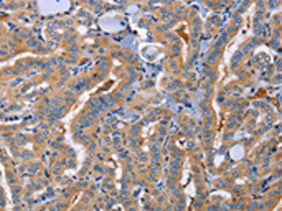 The image on the left is immunohistochemistry of paraffin-embedded Human thyroid cancer tissue using CSB-PA984002(SIGLEC6 Antibody) at dilution 1/70, on the right is treated with synthetic peptide. (Original magnification: ×200)