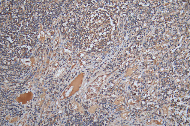 IHC image of CSB-PA021369ESR2HU diluted at 1:200 and staining in paraffin-embedded human lymph node tissue performed on a Leica BondTM system. After dewaxing and hydration, antigen retrieval was mediated by high pressure in a citrate buffer (pH 6.0). Section was blocked with 10% normal goat serum 30min at RT. Then primary antibody (1% BSA) was incubated at 4°C overnight. The primary is detected by a Goat anti-rabbit polymer IgG labeled by HRP and visualized using 0.05% DAB.