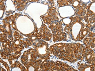 • The image on the left is immunohistochemistry of paraffin-embedded Human thyroid cancer tissue using CSB-PA572733(SLC12A4 Antibody) at dilution 1/30, on the right is treated with fusion protein. (Original magnification: ×200)