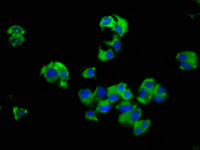 Immunofluorescence staining of MCF-7 cells with CSB-PA615678LA01HU at 1:66, counter-stained with DAPI. The cells were fixed in 4% formaldehyde, permeabilized using 0.2% Triton X-100 and blocked in 10% normal Goat Serum. The cells were then incubated with the antibody overnight at 4°C. The secondary antibody was Alexa Fluor 488-congugated AffiniPure Goat Anti-Rabbit IgG(H+L).