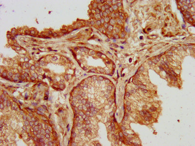 IHC image of CSB-PA615678LA01HU diluted at 1:200 and staining in paraffin-embedded human prostate tissue performed on a Leica BondTM system. After dewaxing and hydration, antigen retrieval was mediated by high pressure in a citrate buffer (pH 6.0). Section was blocked with 10% normal goat serum 30min at RT. Then primary antibody (1% BSA) was incubated at 4°C overnight. The primary is detected by a biotinylated secondary antibody and visualized using an HRP conjugated SP system.