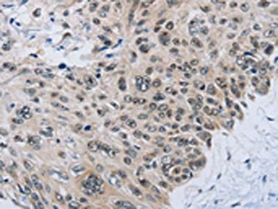 The image on the left is immunohistochemistry of paraffin-embedded Human esophagus cancer tissue using CSB-PA968241(SLC16A4 Antibody) at dilution 1/80, on the right is treated with synthetic peptide. (Original magnification: ×200)