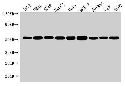 Positive WB detected in: 293T whole cell lysate, U251 whole cell lysate, A549 whole cell lysate, HepG2 whole cell lysate, Hela whole cell lysate, MCF-7 whole cell lysate, Jurkat whole cell lysate, U87 whole cell lysate, K562 whole cell lysate