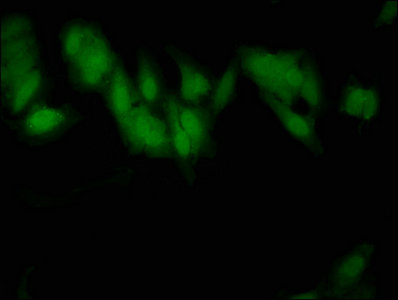 Immunofluorescent analysis of Hela cells using CSB-PA021557EA01HU at dilution of 1:100 and Alexa Fluor 488-congugated AffiniPure Goat Anti-Rabbit IgG(H+L)