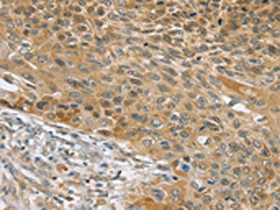 The image on the left is immunohistochemistry of paraffin-embedded Human esophagus cancer tissue using CSB-PA255275(SLC39A3 Antibody) at dilution 1/30, on the right is treated with synthetic peptide. (Original magnification: ×200)