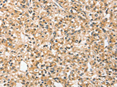 The image on the left is immunohistochemistry of paraffin-embedded Human liver cancer tissue using CSB-PA190316(SLC44A2 Antibody) at dilution 1/20, on the right is treated with synthetic peptide. (Original magnification: ×200)