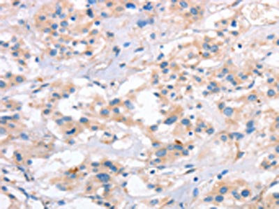 • The image on the left is immunohistochemistry of paraffin-embedded Human thyroid cancer tissue using CSB-PA954798(SLC4A1 Antibody) at dilution 1/15, on the right is treated with synthetic peptide. (Original magnification: ×200)