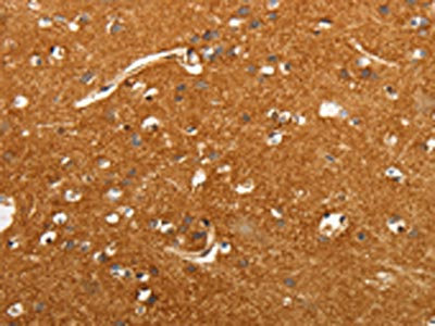 The image on the left is immunohistochemistry of paraffin-embedded Human brain tissue using CSB-PA211509(SLC4A4 Antibody) at dilution 1/50, on the right is treated with fusion protein. (Original magnification: ×200)