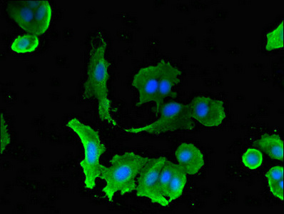 Immunofluorescent analysis of MCF-7 cells using CSB-PA021675LA01HU at dilution of 1:100 and Alexa Fluor 488-congugated AffiniPure Goat Anti-Rabbit IgG(H+L)