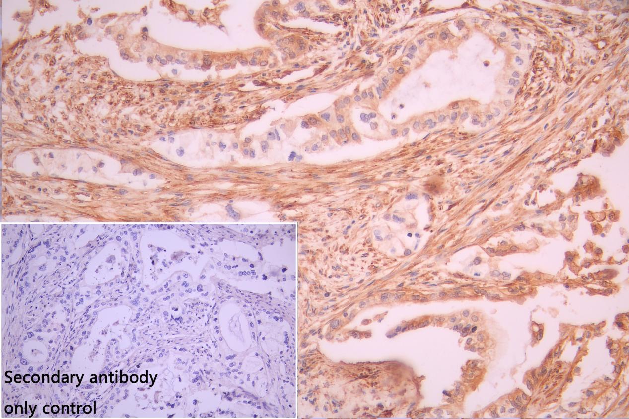 IHC image of CSB-PA892349LA01HU diluted at 1:100 and staining in paraffin-embedded human pancreatic cancer performed on a Leica BondTM system. After dewaxing and hydration, antigen retrieval was mediated by high pressure in a citrate buffer (pH 6.0). Section was blocked with 10% normal goat serum 30min at RT. Then primary antibody (1% BSA) was incubated at 4°C overnight. The primary is detected by a Goat anti-rabbit polymer IgG labeled by HRP and visualized using 0.05% DAB. Secondary antibody only control: uses 1% BSA instead of primary antibody