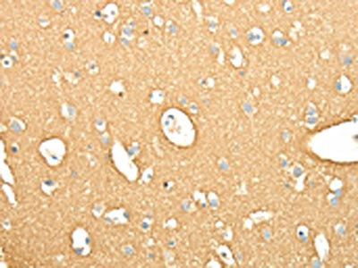 The image on the left is immunohistochemistry of paraffin-embedded Human brain tissue using CSB-PA585168(SNAP25 Antibody) at dilution 1/25, on the right is treated with fusion protein. (Original magnification: ×200)