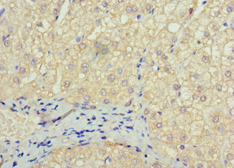 Immunofluorescent analysis of HepG2 cells using CSB-PA022422LA01HU at dilution of 1:100 and Alexa Fluor 488-congugated AffiniPure Goat Anti-Rabbit IgG(H+L)