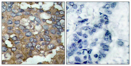 • Immunohistochemical analysis of paraffin-embedded human breast carcinoma tissue using Src(Ab-529) Antibody(left) or the same antibody preincubated with blocking peptide(right).