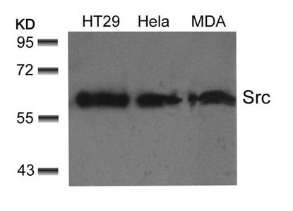• Western blot analysis of extracts from HT29, Hela and MDA cells using Src(Ab-529) Antibody.