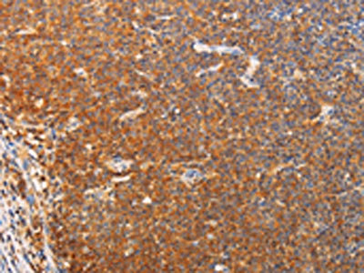 The image on the left is immunohistochemistry of paraffin-embedded Human lymphoma tissue using CSB-PA080378(SRC Antibody) at dilution 1/20, on the right is treated with fusion protein. (Original magnification: ×200)