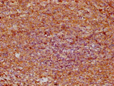 IHC image of CSB-PA022664EA01HU diluted at 1:400 and staining in paraffin-embedded human spleen tissue performed on a Leica BondTM system. After dewaxing and hydration, antigen retrieval was mediated by high pressure in a citrate buffer (pH 6.0). Section was blocked with 10% normal goat serum 30min at RT. Then primary antibody (1% BSA) was incubated at 4°C overnight. The primary is detected by a biotinylated secondary antibody and visualized using an HRP conjugated SP system.