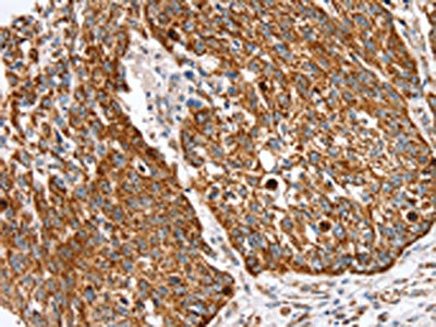 The image on the left is immunohistochemistry of paraffin-embedded Human lung cancer tissue using CSB-PA326406(SSBP1 Antibody) at dilution 1/30, on the right is treated with fusion protein. (Original magnification: ×200)