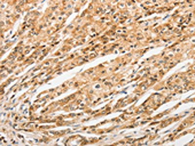 The image on the left is immunohistochemistry of paraffin-embedded Human thyroid cancer tissue using CSB-PA620044(STAM Antibody) at dilution 1/40, on the right is treated with fusion protein. (Original magnification: ×200)