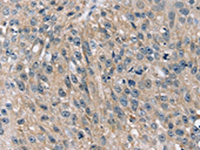 The image on the left is immunohistochemistry of paraffin-embedded Human liver cancer tissue using CSB-PA108943(STK33 Antibody) at dilution 1/45, on the right is treated with fusion protein. (Original magnification: ×200)