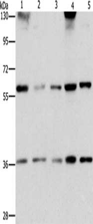 Gel: 6%SDS-PAGE, Lysate: 40 μg, Lane 1-5: PC3 cells, hela cells, human bladder carcinoma tissue, A172 cells, hepG2 cells, Primary antibody: CSB-PA168071(STK3/STK4 Antibody) at dilution 1/1000, Secondary antibody: Goat anti rabbit IgG at 1/8000 dilution, Exposure time: 10 seconds