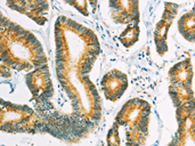 • The image on the left is immunohistochemistry of paraffin-embedded Human colon cancer tissue using CSB-PA954231(SUFU Antibody) at dilution 1/10, on the right is treated with fusion protein. (Original magnification: ×200)