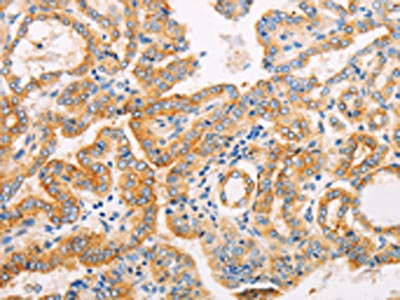 • The image on the left is immunohistochemistry of paraffin-embedded Human thyroid cancer tissue using CSB-PA954231(SUFU Antibody) at dilution 1/10, on the right is treated with fusion protein. (Original magnification: ×200)