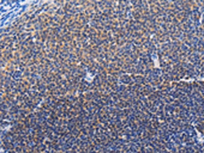 • The image on the left is immunohistochemistry of paraffin-embedded Human lymphoma tissue using CSB-PA832352(SYK Antibody) at dilution 1/20, on the right is treated with fusion protein. (Original magnification: ×200)