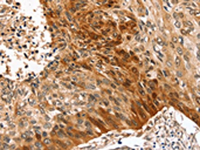 The image on the left is immunohistochemistry of paraffin-embedded Human esophagus cancer tissue using CSB-PA461485(SYNPO2 Antibody) at dilution 1/50, on the right is treated with synthetic peptide. (Original magnification: ×200)