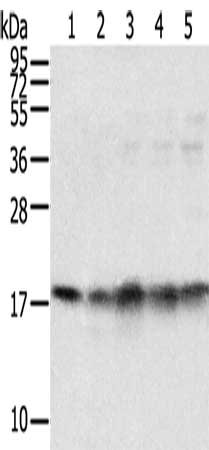 Gel: 12%SDS-PAGE, Lysate: 40 μg, Lane 1-5: Mouse brain tissue, Mouse heart tissue, Jurkat cells, K562 cells, hela cells, Primary antibody: CSB-PA210339(TAF11 Antibody) at dilution 1/800, Secondary antibody: Goat anti rabbit IgG at 1/8000 dilution, Exposure time: 20 seconds