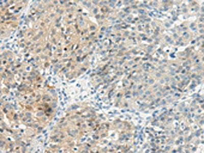 • The image on the left is immunohistochemistry of paraffin-embedded Human breast cancer tissue using CSB-PA449379(TBXA2R Antibody) at dilution 1/45, on the right is treated with synthetic peptide. (Original magnification: ×200)